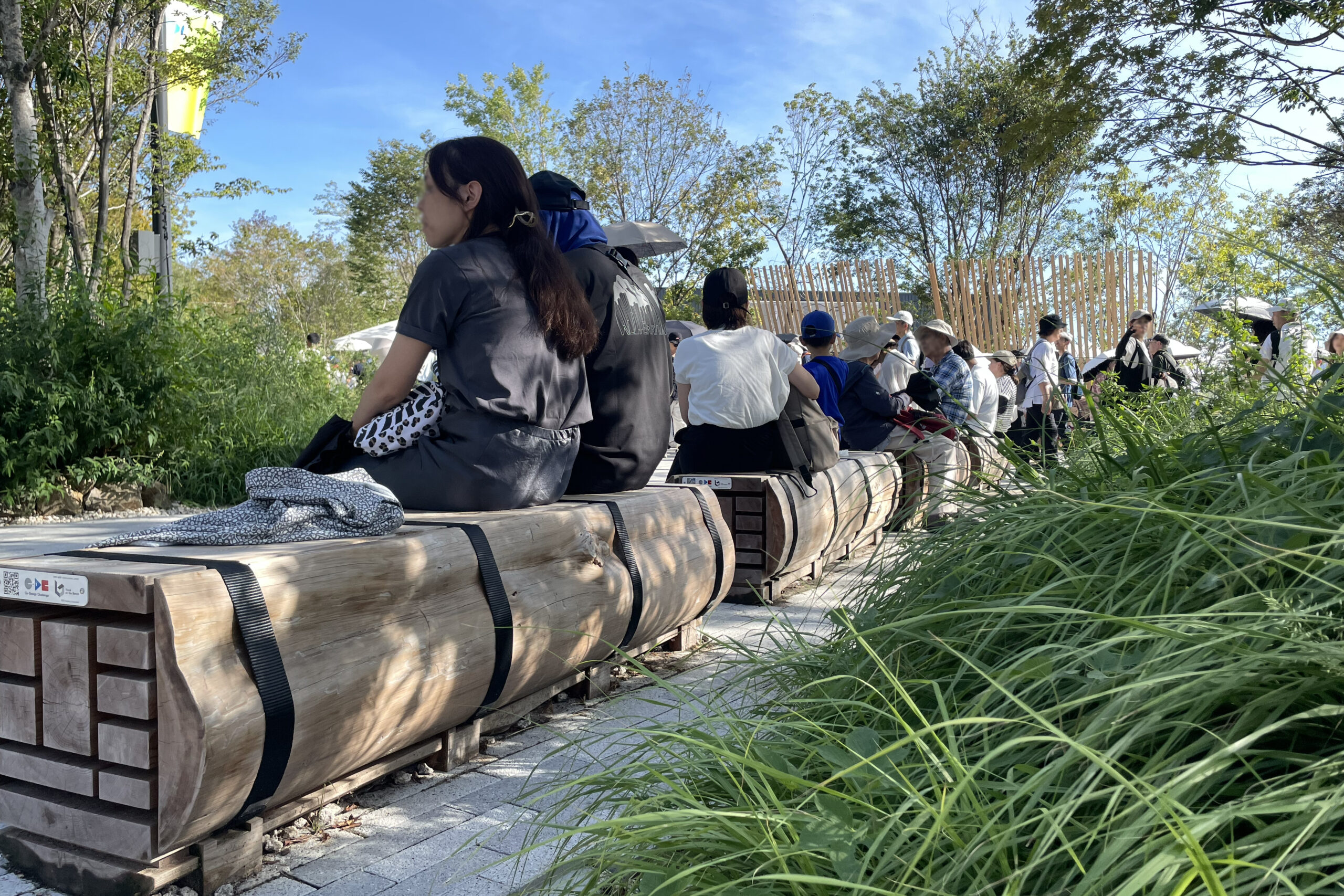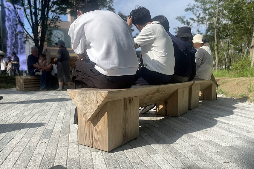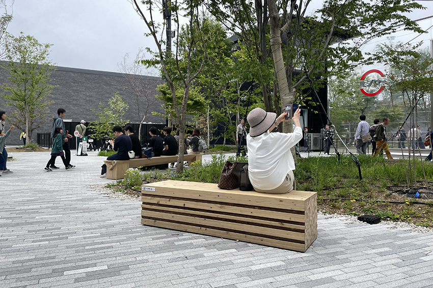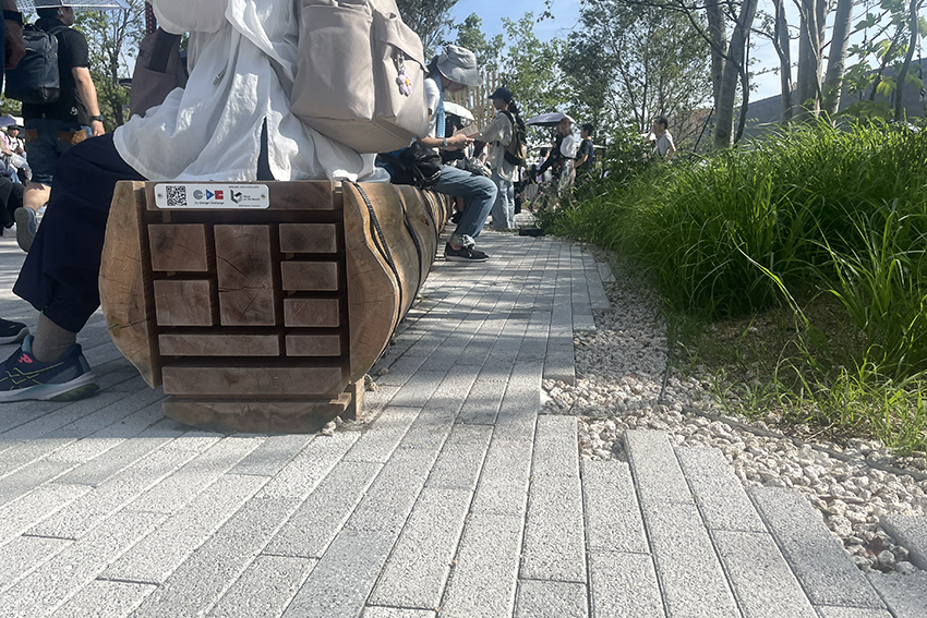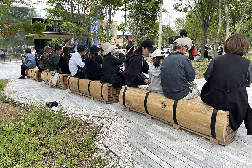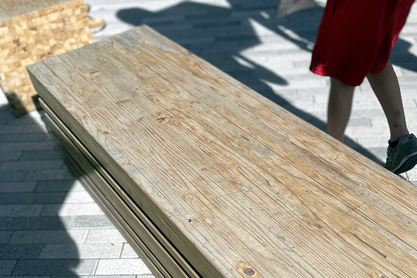 3種類のベンチが緑道のそばに設置されました。左が「C/D Bench」、右が「TREE」。 一本の樹がそのまま横たわったように並ぶ「FILLET」。 ベンチに貼られた二次元コードから、プロジェクトのいろんな「想い」をWEBで読むことができます。 設置から5ヶ月経った9月。時間の流れを感じる座面。 腰掛けて休憩したり、お弁当を食たり、通り抜けたり、そばで子どもが遊んだり。時間によっては木漏れ日が落ちてきていました。 「TREE」の1人がけの小さいものは、机にしたり、向かい合って座ったり、使う人が自由に移動したのか、位置が日々変化していました。 「想うベンチ」について詳しくはこちら>>