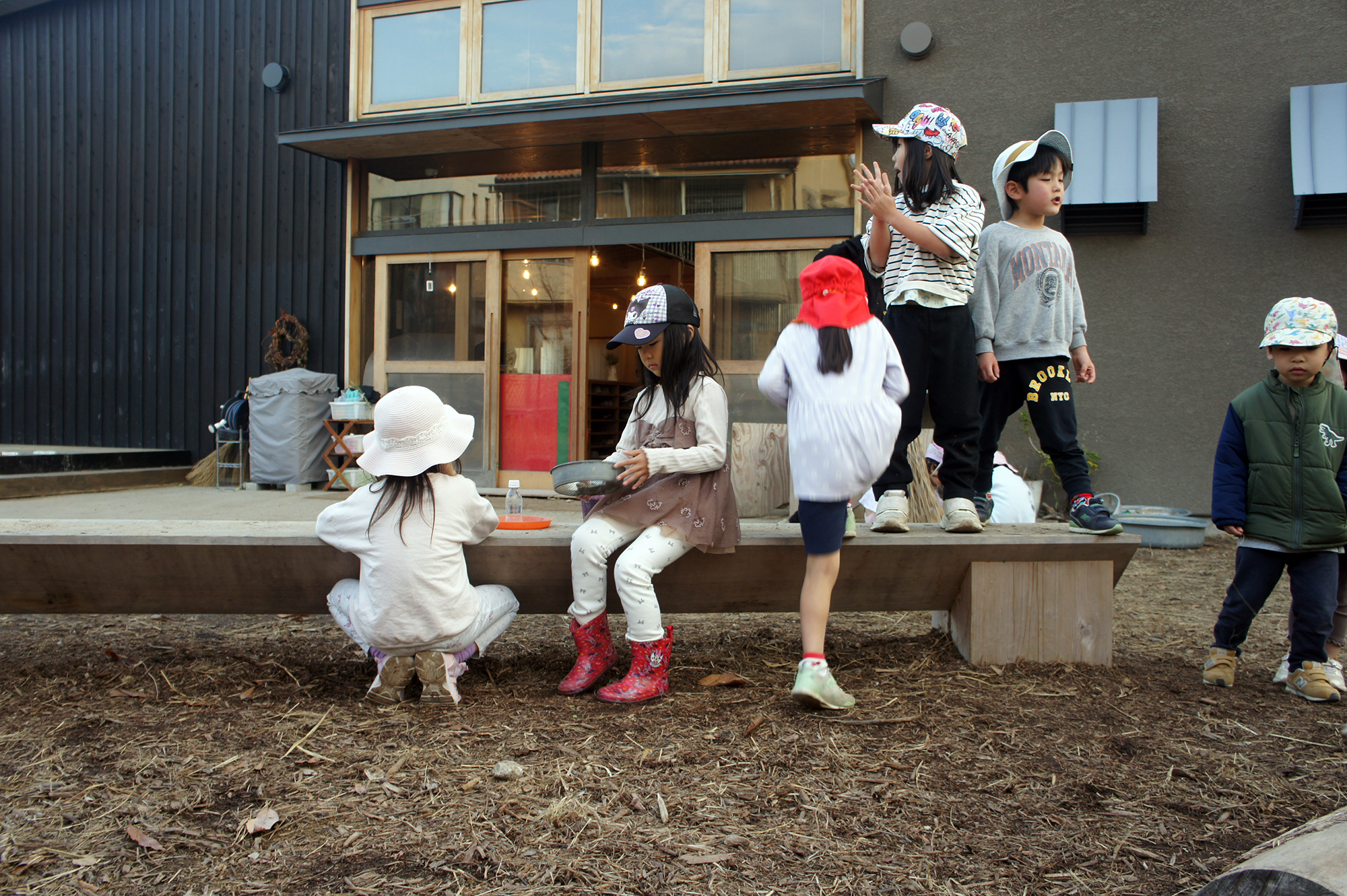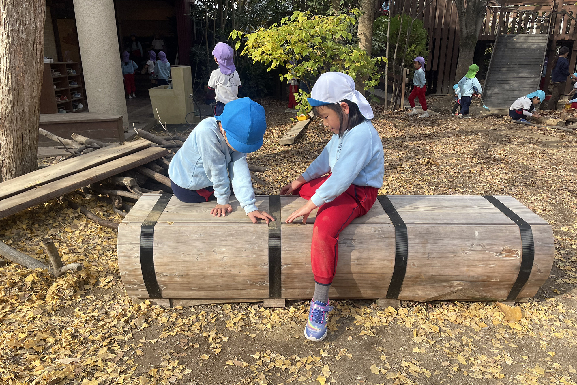 「ここに置いた時、『これはベンチだよ』とは言わずに、どう使うか、大人たちは見守ってたんです」という園長の関さん。「まずは橋にしたり、登ったり、このベンチが遊びの中心に。ベンチのある風景に慣れてきた今は、鬼ごっこの集合場所になったり、テーブルみたいにいろんなものを並べる子もいます。スタッフもここに座って木のおもちゃづくりなどの作業をしたり」。座るだけなら椅子でもいい。でもベンチだから生まれたシーンもあると関さんは語ります。「ベンチって二人以上が腰掛けるからこそ自然とコミュニケーションが生まれるんだなって、つくづく思いました」。