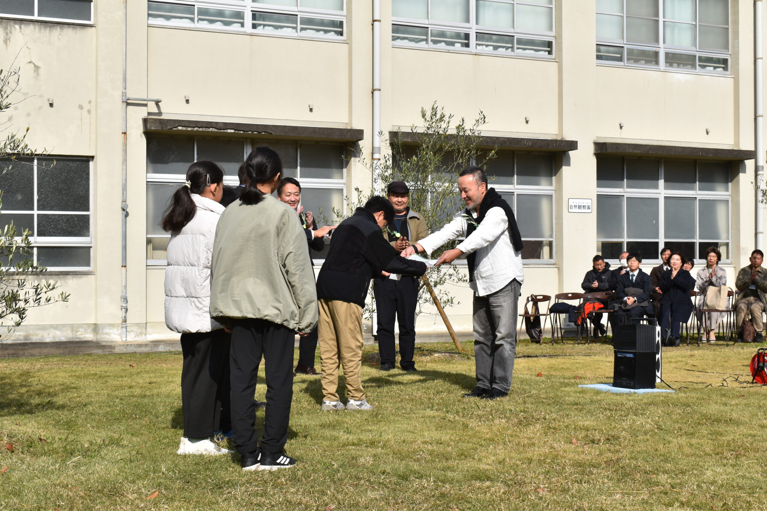 地域の方や制作関係者も招かれたベンチの引き継ぎ式では「なぜベンチに模様をつけなかったのですか?」と児童から質問が。「年輪で時間を感じたり、森での樹の姿を想像したりできるよう、できるだけ“樹のありのまま”を形にした」と「TREE」への想いを語ったのはデザイナーの松井貴さん。制作を担当した家具職人の服部智樹さんからは、オリーブの搾りかすを使ったベンチのお手入れの話も。「みんなでどうしたらいいんだろうって考えながら手入れをしていけば、50年、100年と使えるベンチだと思う」。真剣に耳を傾ける子どもたち。代表の児童は「ベンチだけでなく、想いもぜんぶ引き継ぎたい」と締めくくりました。