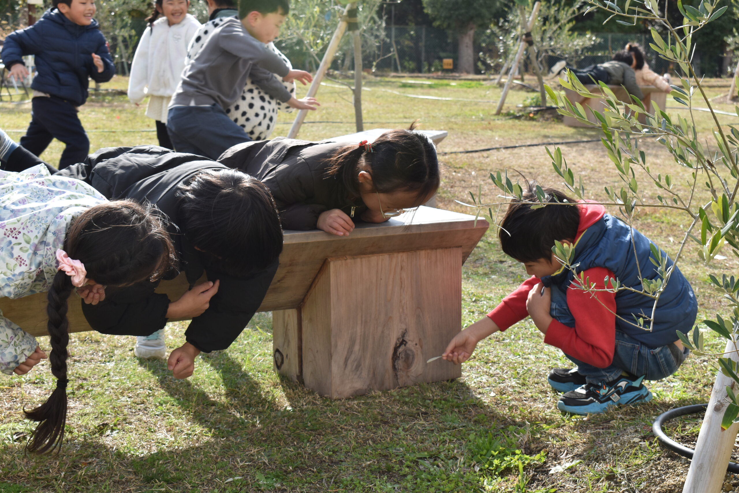 オリーブの森では、日々子どもたちが「実がたくさんなる方法はあるかな?」「オリーブの葉で発電できるかも⁉」と、身近ないのちにふれるなかで考え、さまざまな活動のアイデアを膨らませています。